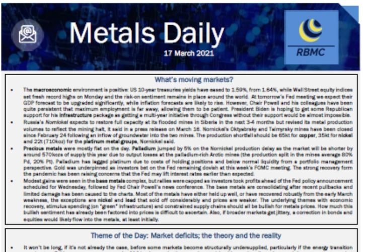 A concise 2-page report covering macroeconomic developments, precious and base metals markets.